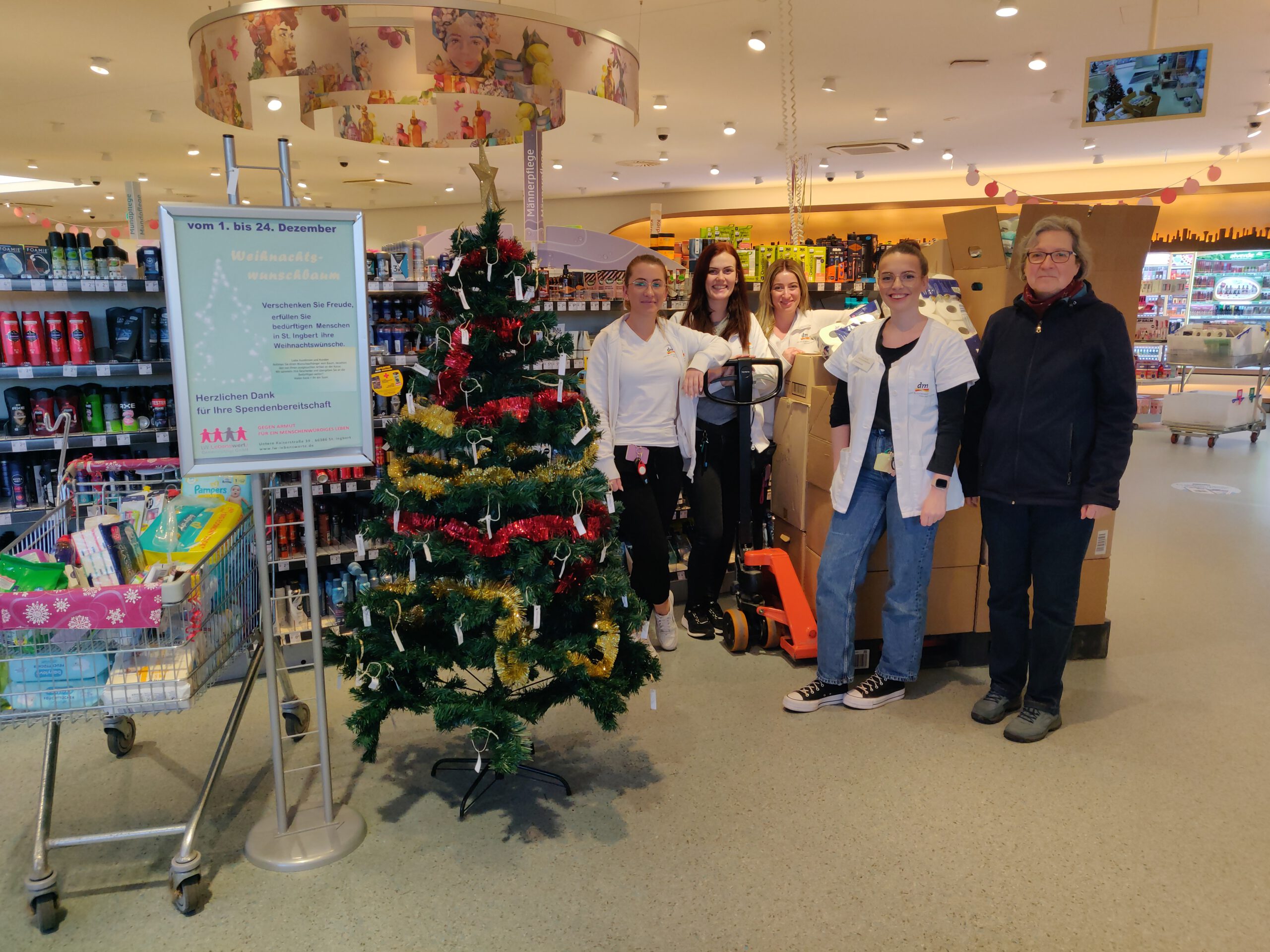 Der dm – Drogerie Markt St. Ingbert in der Südstraße hatte sich bei der diesjährigen Weihnachtsaktion für die LW lebenswerte gemeinnützige GmbH St. Ingbert als Spendenpartner in entschieden. Während der Weihnachtsspendenaktion konnten die Kundeninnen und Kunden im dm Markt vom Weihnachtsbaum einen Wunschanhänger abnehmen, den Artikel ihrer Wahl einkaufen und diesen an der Kasse als Spende abgeben.