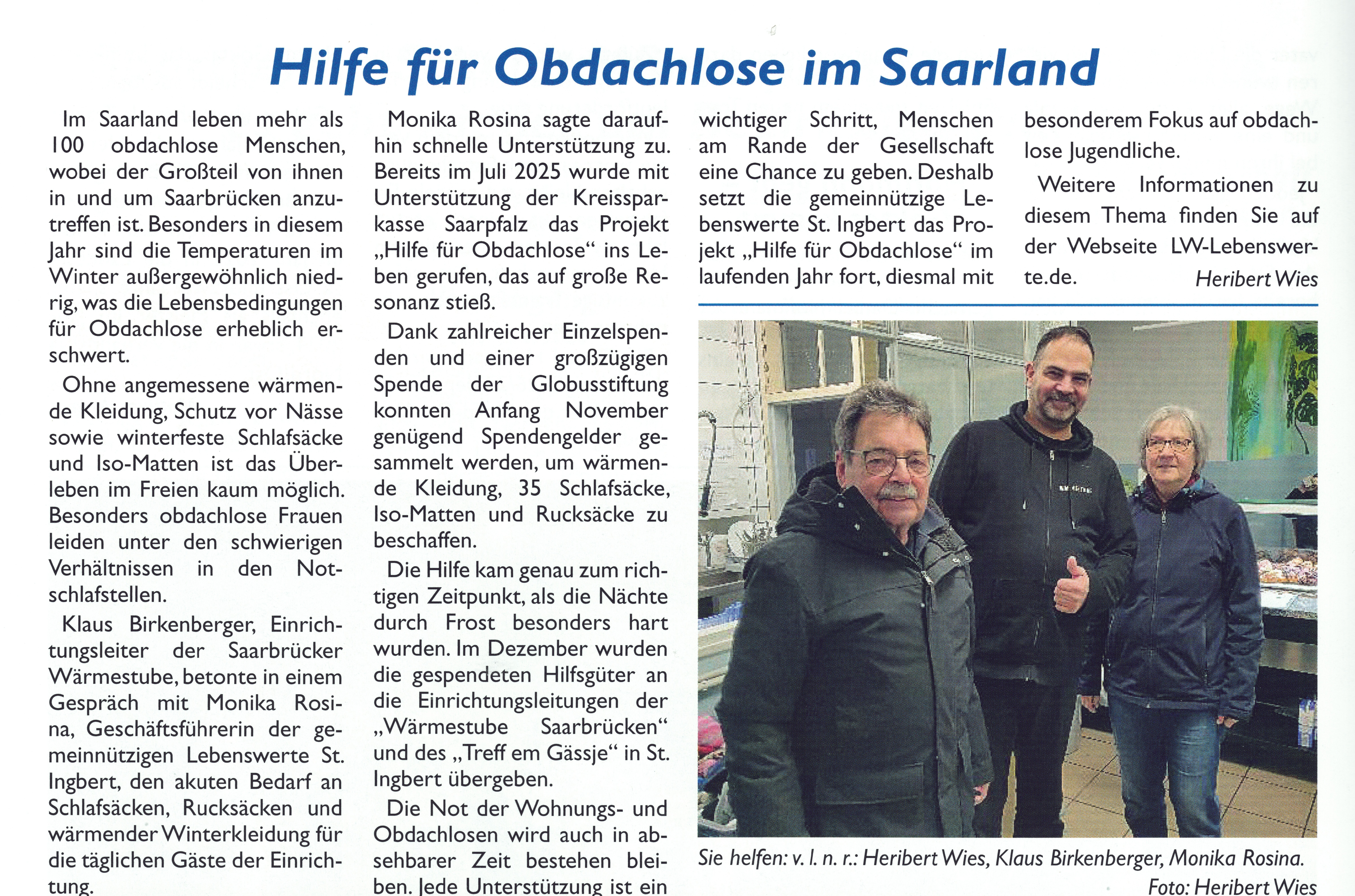 Klaus Birkenberger, Einrichtungsleiter der Saarbrücker Wärmestube, betonte in einem Gespräch mit Monika Rosina, Geschäftsführerin der gemeinnützigen Lebenswerte St. Ingbert, den akuten Bedarf an Schlafsäcken, Rucksäcken und wärmender Winterkleidung für die täglichen Gäste der Einrichtung. Monika Rosina sagte daraufhin schnelle Unterstützung zu. Bereits im Juli 2025 wurde mit Unterstützung der Kreissparkasse Saarpfalz das Projekt „Hilfe für Obdachlose“ ins Leben gerufen, das auf große Resonanz stieß. Dank zahlreicher Einzelspenden und einer großzügigen Spende der Globusstiftung konnten Anfang November genügend Spendengelder gesammelt werden, um wärmende Kleidung, 35 Schlafsäcke, IOS-Matten und Rucksäcke zu beschaffen. Die Hilfe kam genau zum richtigen Zeitpunkt, als die Nächte durch Frost besonders hart wurden. Im Dezember wurden die gespendeten Hilfsgüter an die Einrichtungsleitungen der „Wärmestube Saarbrücken“ und des „Treff em Gässje“ in St. Ingbert übergeben.